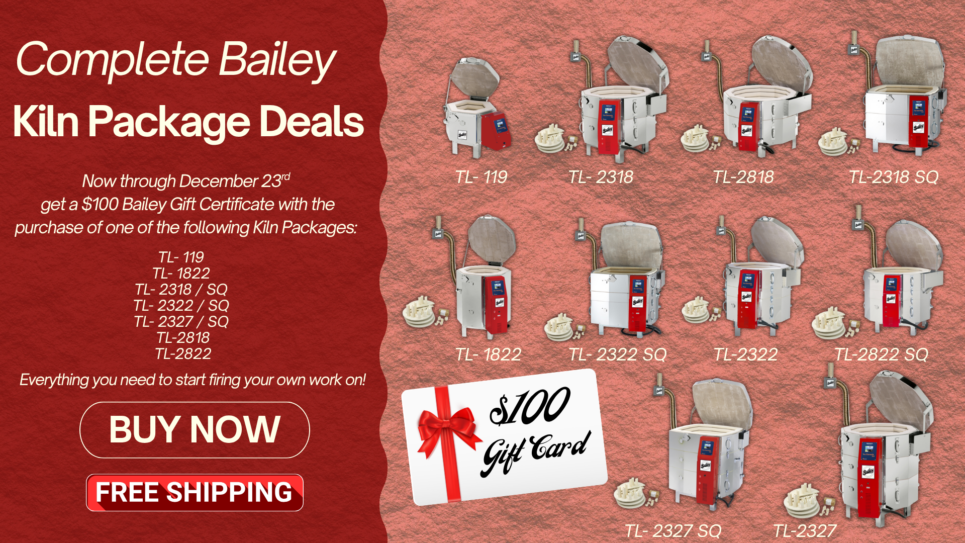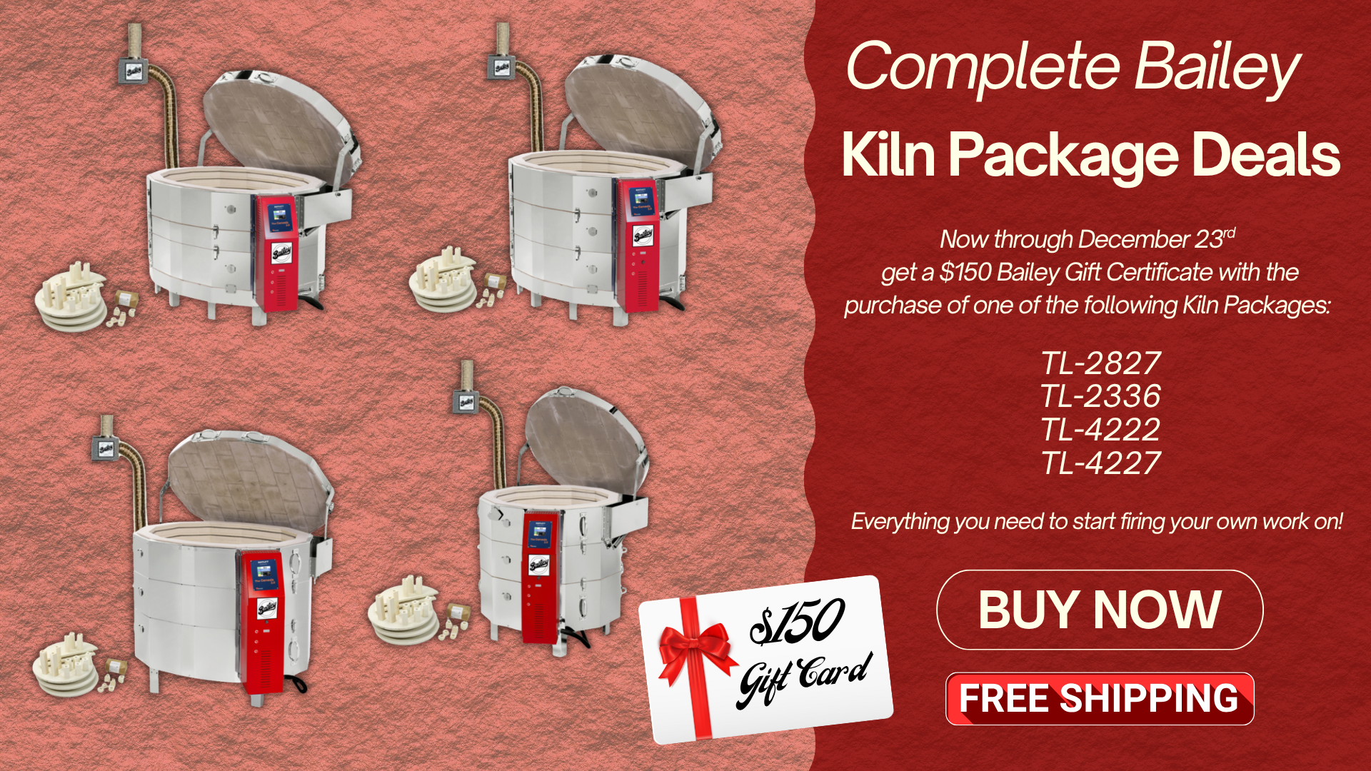 Founded in 1976, Bailey Pottery Equipment and Ceramic Supply offers everything for the active pottery studio and ceramics department. We design and manufacture the most innovative pottery wheels, slab rollers, clay extruders, electric kilns, gas kilns, pugmills and clay mixers in the world. Bailey’s reputation for high quality equipment is well known. In addition, we represent the best brands of pottery tools, equipment and supplies in the industry- all at great discounts. You will appreciate our fast, reliable service and expert sales staff. We guarantee that you will be satisfied with your purchase. You can order online anytime or call us toll free at (800) 431-6067 to have all your questions answered by our professional sales staff.